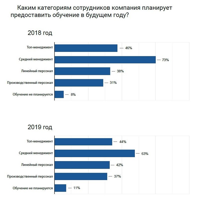 В 2020 году компании (63% опрошенных) планируют уделить больше внимания обучению менеджеров среднего звена. При этом 30% опрошенных уже точно решили, что будут обращаться за обучением в бизнес-школы, 50% еще не определились.